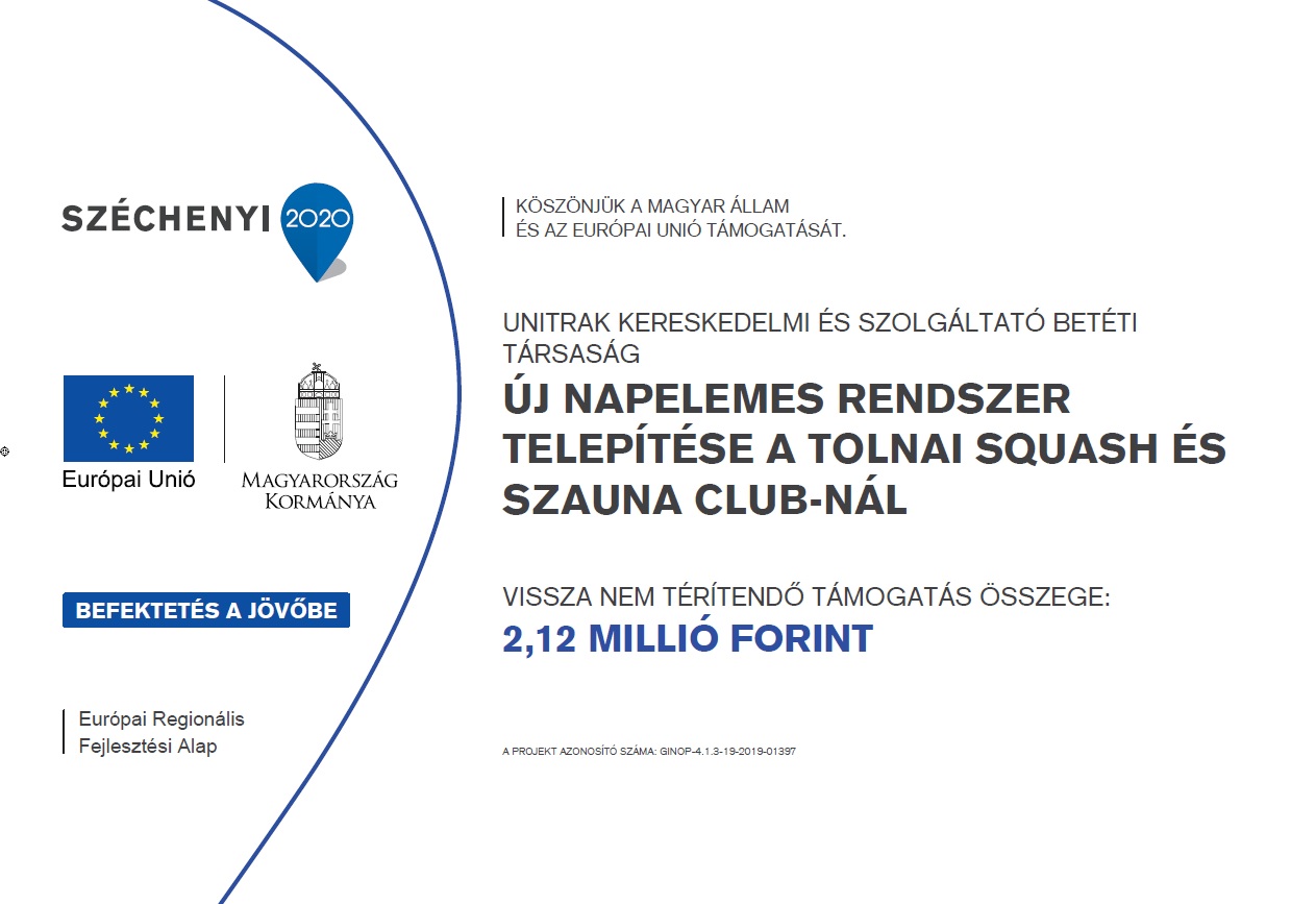 A projekt célja az UNITRAK Bt. tolnai telephelyén (Squash és Szauna Club) egy olyan napelemes rendszer telepítése és üzembe helyezése, amely a cég villamos energia-fogyasztását mérsékli, ezáltal a működés költségeit csökkenti. A fejlesztéssel érintett ingatlan a pályázó telephelye. Az elmúlt egy évben 11 736 kWh elektromos áramfogyasztás volt kimutatható, így a primer energiafogyasztás és az üvegházhatású gázok kibocsátásának csökkentése érdekében, valamint szem előtt tartva a környezettudatos gazdasági versenyképesség erősítését, a környezetterhelés csökkentését, illetve a pályázó vállalkozás rezsiköltségekhez kötődő terheinek enyhítését, a szükséges önerő biztosításával tervezi megvalósítani a pályázó a fejlesztést.